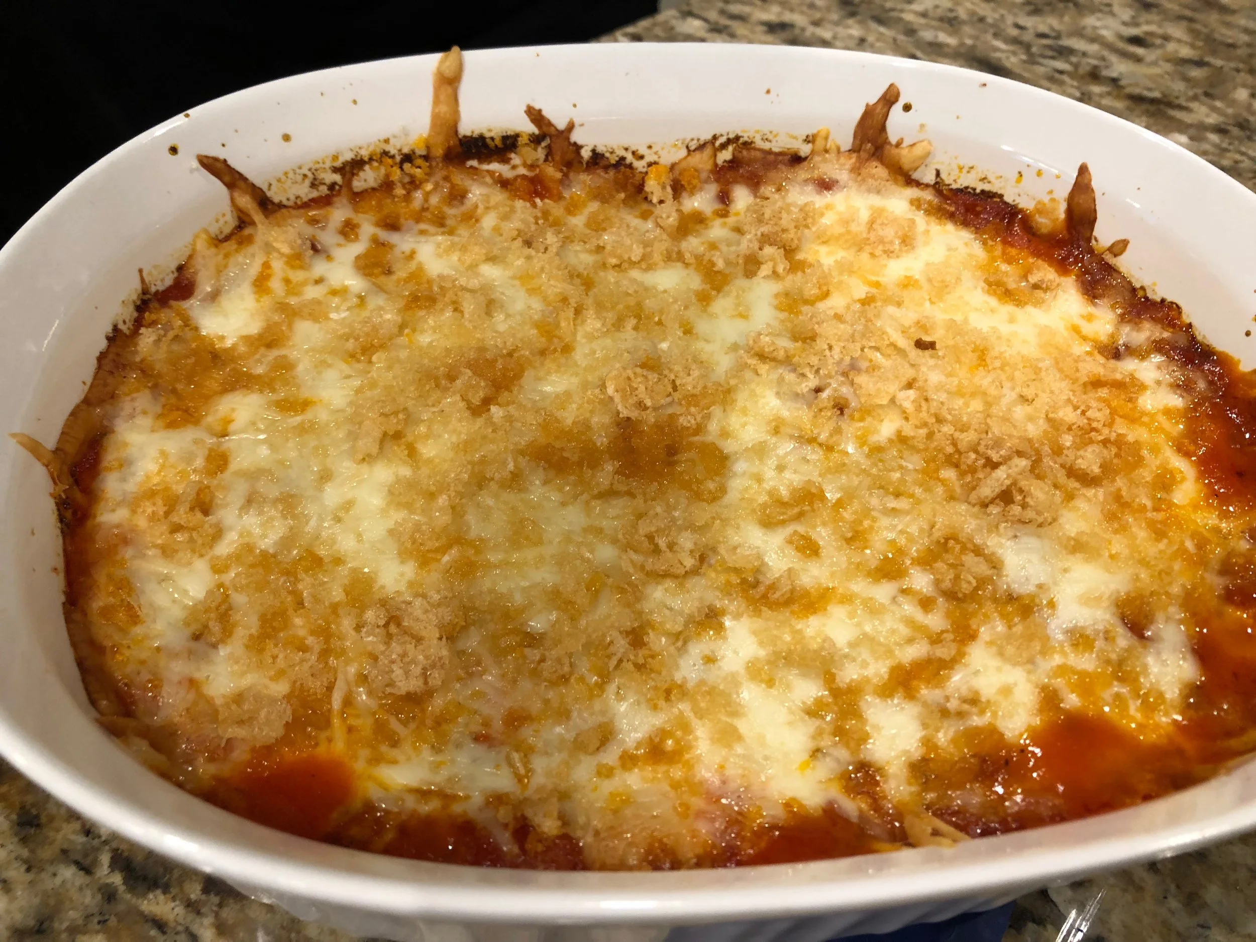 Pour 1 C frozen or fresh riced cauliflower into dish. Top with seasoning. Add chicken, then pasta sauce, cheeses and pork rinds.